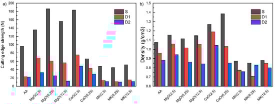 The data from the cutting edge strength measurement showed that the cutting edge strength of the modified natural zeolite by CaO and MgO was significantly increased up to two times (Figure 6a). The only exception was the CaO(6.25) sample, there was a slight decrease in the strength compared to the AA-S sample.