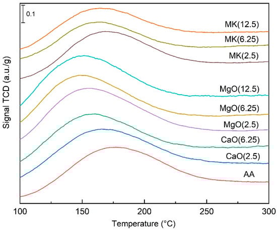 The amount, type and strength of acid sites on the surface of D2 samples plays a crucial role in promoting catalytic activity [21] and thus the acidity was determined by temperature-programmed ammonia desorption (NH3-TPD). It can be seen from Figure 7, that the TPD curves contained a dominant low-temperature peak with a center between 148 °C and 172 °C. This temperature maximum is related to the ammonia desorption at weakly acidic Lewis sites. Samples modified with MgO had temperature peaks slightly shifted to lower temperatures compared to the AA-D2 sample and samples modified with CaO and MK. The AA-D2 sample had the lowest Si/Al ratio and on the other hand, MgO modified samples had the highest Si/Al ratio. As stated in the study by Wang et al. (2013) [21], the acid strength of zeolites is associated with the Si/Al molar ratio. This statement is supported by our results, which showed that the lower the Si/Al ratio, the higher the acid strength of zeolite modified MK samples show the lowest concentration of low-temperature acid sites, especially the sample MK(6.25) which has the concentration of low-temperature acid sites just 0.204 mmol/g. (Table 4).