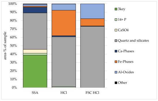 Composition of untreated SSA before and after chemical digestion by different acids (generic labelling); SSA: untreated, original sewage sludge ash, HCl: residue after SSA digestion with HCl; FSC-HCl: residue of HCl digestion of thermochemically treated SSA. Shares of material given in area-%.