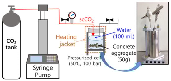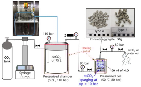 - Chung, C.W.; Lee, M.; Kim, S.O.; Kim, J. The pH reduction of the recycled aggregate originated from the waste concrete by the scCO2 treatment. Econ. Environ. Geol. 2017, 50, 257–266. [Google Scholar] [CrossRef]
