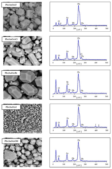 To evaluate the Pb and As molar ratio in the obtained materials, the full chemical composition was determined using Inductively Coupled Plasma-Optical Emission Spectrometry (ICP-OES) method (Perkin Elmer Optima 7300DV instrument) following prior digestion of samples in concentrated HNO3 mixed with 0.02M EDTA. The content of F, Br, and I was analyzed using inductively coupled plasma-mass spectrometry (ICP-MS). For technical reasons, the content of Cl was determined using SEM/EDS. The OH content was assumed based on the stoichiometry of the ideal formula.