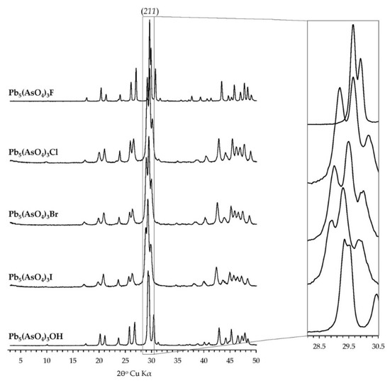 X-ray diffraction patterns of synthesized phases indicated that the synthesized products were crystalline analogues of Pb-As apatites (Figure 2). No other phases were detected at the detection limit of the method, which is ca. 0.1 wt %. Based on the obtained diffraction patterns and by analogy with other apatites, it was assumed that all synthesized mimetites crystallized in the hexagonal system, in space group P63/m, ITC No. 176. The position of an intense reflection (211) shifted from 29.62°2θ for mimetite-F to 29.41°2θ for mimetite-I, as presented in Figure 2. Systematic shifts of diffraction peaks toward lower 2θ value were apparent with the increase in the halogen’s ionic radius, excluding mimetite-OH, which did not follow the trend.