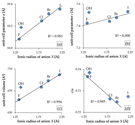 Variations in the unit-cell parameters of substituted apatites based on the results of this study and existing literature ([11,68,69,70,71,72,73] and ICDD cards no. 23-0112 and no. 38-0383): (a) unit-cell parameter a, (b) unit-cell parameter c, and (c) unit-cell volume, compared with a substituting anion’s ionic radius, where ionic radius for F = 1.33 Å, OH = 1.37 Å, Cl = 1.81 Å, Br = 1.96 Å, and I = 2.20 Å.
