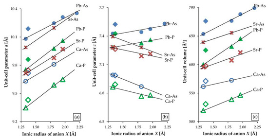 With the use of pattern recognition and artificial neural networks techniques, Wu et al. [19] revealed that ionic radii predominantly regulate the unit-cell parameters of apatites. They also concluded that there was a strong nonlinear relationship between the unit-cell parameters and the ionic radii. However, our observations based not only on the results of this study but also on existing literature data of selected apatites negate the latter statement. Figure 5 presents the relationship between the unit-cell parameters a and c as well as the unit-cell volume of selected apatites, and the ionic radii of an anion at the position X (F, Cl, Br, I, and OH). Lead, calcium, and strontium phosphates and arsenates were selected: Pb-As apatites from this study; Pb-P and Ca-P apatites after Kim et al. [11]; Ca5(AsO4)3OH after Lee et al. [68]; Ca5(AsO4)3F according to ICDD card no. 23-0112; Ca5(AsO4)3Cl according to ICDD card no. 38-0383; Sr5(PO4)3OH after Sudarsanan and Young [69]; Sr5(PO4)3F after Corker et al. [70]; Sr5(PO4)3Cl after Nötzold et al. [71]; Sr5(PO4)3Br after Alberius-Henning et al. [72]; Sr5(AsO4)3F and Sr5(AsO4)3Cl after Đordević et al. [73]. For all presented series, halogen apatites form linear trends while hydroxyl apatites do not adhere to the pattern: their position is always above the regression line. The unit-cell parameter a increases with the increase in halogen’s ionic radius (Figure 5a). In contrast, unit-cell parameter c decreases with the increase in the ionic radius of X except for lead apatites (both phosphates and arsenates), which show an increase in c as the size of halogen increases (Figure 5b). The variability of parameter a is much greater than parameter c. Hence, irrespective of the direction of change of a parameter c, in all the series, the volume of a unit-cell increases linearly with the halogen anion’s radius (Figure 5c). The results of this study allowed to include the iodine apatite in the calculation for the first time. The phase follows the general linear trend as presented in Figure 5.