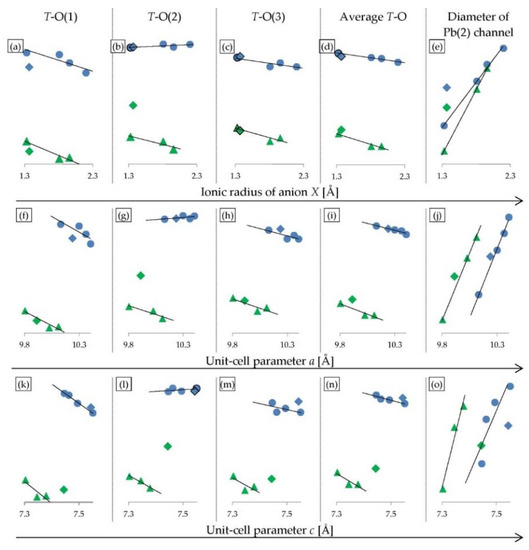 Systematic structural changes in the studied phases resulted in various linear relationships in the series from mimetite-F to -I. Similar dependencies were found in halogenated pyromorphites reported by Kim et al. [11]. A comparison of selected linear correlations of interatomic distances for halogenated mimetites (from this study) and halogenated pyromorphites [11] are shown in Figure 6. Strong linear correlations were with the anion’s ionic radius (Figure 6a–e). Similar trends were also observed with the unit-cell parameter a (Figure 6f–j) and with the unit-cell parameter c (Figure 6k–o). Linear relations with the anion’s ionic radius and with the average crystal radius were identical (data not shown). In most cases, apatites-OH did not follow the linear trends discovered in the series of apatites -F-Cl-Br-I. In mimetites, (As–O) distances within the TO4 tetrahedra changed to a similarextent as in pyromorphites (P–O), although the As-O bond lengths are significantly greater than the P-O bond lengths (Figure 6a–d,f–i,k–n). Moreover, T–O(1) and T–O(3) distances decreased in both series. However, As-O(2) distances increased within the mimetite series, which is in contrast to pyromorphites (Figure 6b,g,l). Nevertheless, the average T–O distances changed in the same direction in mimetites (As–O) as in pyromorphites (P–O) (Figure 6d,i,n). No obvious relationships between the Pb–O bond distances and unit-cell parameters as well as anion’s ionic radius were observed. The Pb(1)–O and Pb(2)–O bond distances in mimetites ranged from 2.321(7) Å to 3.264(0) Å (Table 3). There were similar findings in pyromorphites, with the values ranging from 2.359(3) Å to 3.281(4) Å [11]. In overall terms, this indicates that halogen substitutions have similar effect on the structure of mimetites, as on pyromorphites.