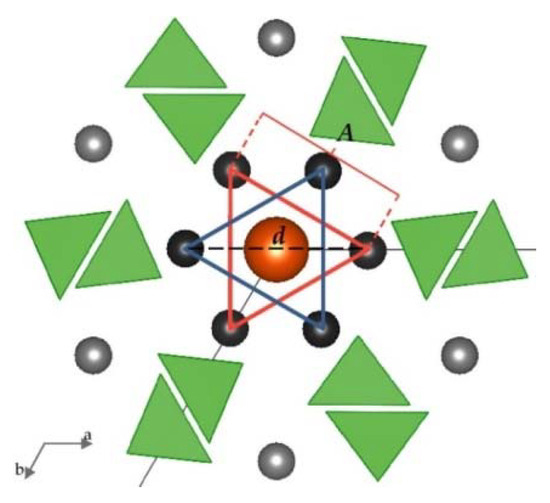 Projection of apatite structure on (001), enabling quantitative determination of the diameter of the channels accommodating X anions. Black atoms are Pb(2), grey atoms are Pb(1), an orange atom is X anion, and the green triangles are AsO4 tetrahedra. For clarity, oxygen atoms are not shown, and the size of ions is not set to scale. Both blue and red triangles are formed by Pb(2) cations positioned on the same plane. These triangles are located parallel to each other in the channel.