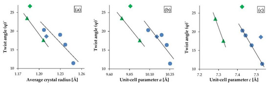 Correlations between metaprism twist angle φ and: (a) average crystal radius, (b) unit-cell parameter a, and (c) unit-cell parameter c. Halogenated mimetites from this study are denoted by blue dots, and pyromorphites-F and -Cl reported by White and Dong [2] are denoted by green triangles. All OH-phases are marked by diamonds: mimetite-OH from this study (blue), and pyromorphite-OH reported by White and Dong [2] (green). Average crystal radius as well as the unit-cell parameters a and c increase in the mimetite series F-Cl-Br-I and in the pyromorphite series F-Cl from left to right.