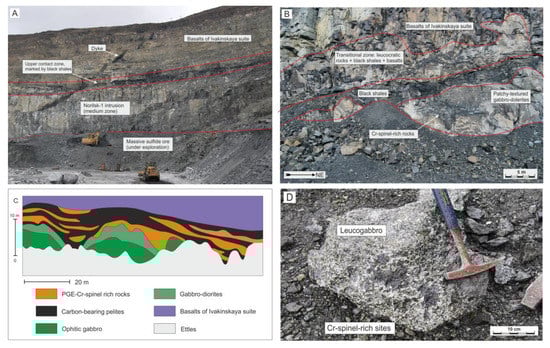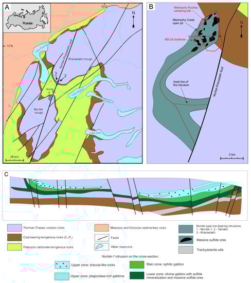 - Sluzhenikin, S.; Krivolutskaya, N.; Rad’Ko, V.; Malitch, K.; Distler, V.; Fedorenko, V. Ultramafic–Mafic Intrusions, Volcanic Rocks and PGE–Cu–Ni Sulfide Deposits of the Noril’sk Province, Polar Siberia. Field Trip Guidebook; Institute of Geology of Ore Deposits, Petrography, Mineralogy and Geochemistry, Yekaterinburg, Russia: Moscow, Russia, 2014. [Google Scholar]