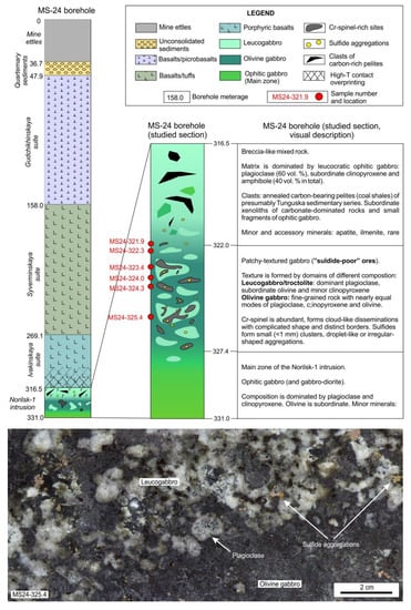 - Sluzhenikin, S.F. Sulfide-Low Platinum Mineralization in Differentiated Basite-Hyperbasite Intrusions of the Noril’sk Region; Institute of Geology of Ore Deposits, Petrography, Mineralogy, and Geochemistry, Russian Academy of Sciences: Moscow, Russia, 2000. (In Russian) [Google Scholar]