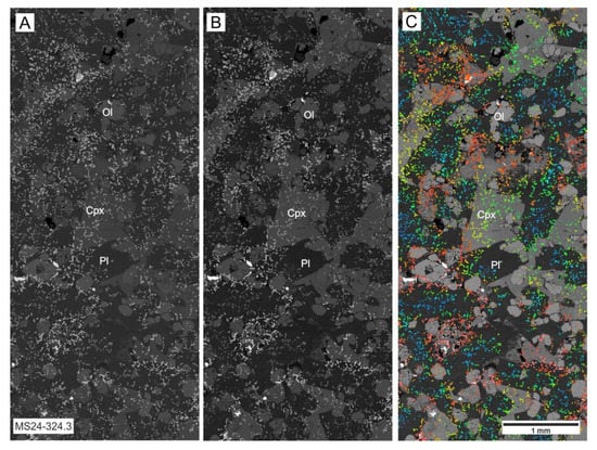 | MS24-324.3 | Olivine-rich ophitic gabbro | Pl+Cpx+Ol | ++ | Euhedral Pl and Ol with interstitial and poikilithic Cpx. Cr-spinel dissemination is moderately dense and homogeneous. |