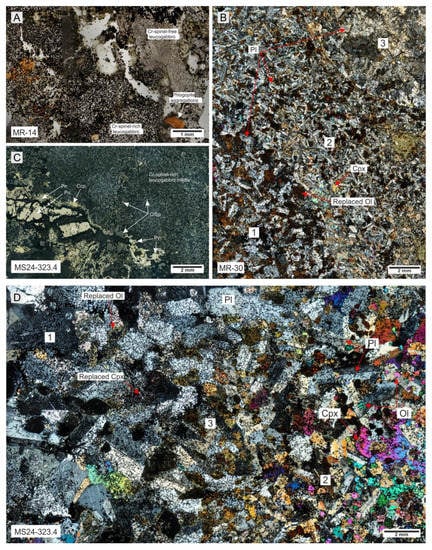 | MR-31 | Ophitic gabbro | Pl+Cpx+Ol * | + | Euhedral elongated Pl with interstitial or poikilithic Cpx *. Occasional sites, moderately enriched of Cr-spinel |