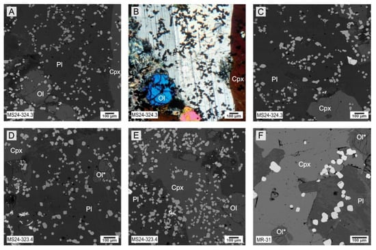 | MS24-322.3 | Ophitic gabbro | Pl+Cpx+Ol * | Scarce | Euhedral elongated Pl with interstitial or poikilithic Cpx * and subhedral Ol *. Cr-spinel is only occasional. |