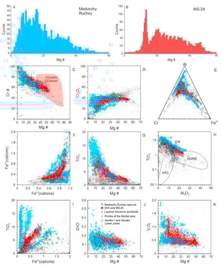 - Barnes, S.J.; Kunilov, V. Spinels and Mg ilmenites from the Noril’sk 1 and Talnakh intrusions and other mafic rocks of the Siberian flood basalt province. Econ. Geol. 2000, 95, 1701–1717. [Google Scholar] [CrossRef]