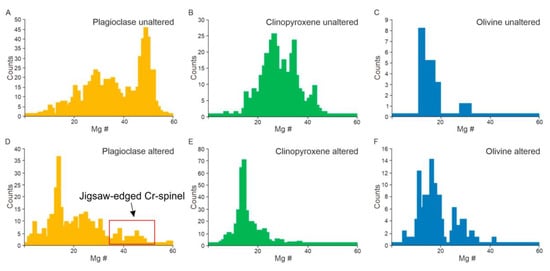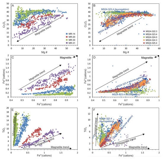 - A less likely possibility is post-magmatic, metamorphic, and hydrothermal alteration of Cr-spinel. Recent studies, however, provided clear evidence that even low-grade metamorphism may dramatically affect compositions of Cr-spinel, shifting it towards more ferrous, ferric, and Zn-rich compositions [77,78,79,80]. In addition, extensive re-deposition of Cr-spinel is thought to occur during various hydrothermal and metasomatic processes [12,67,68,69,70], while experimental studies advocate significant mobility of Cr in fluids [81,82].
