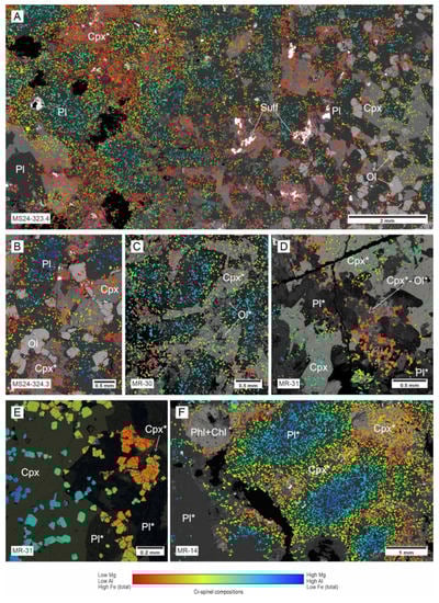 | MR-20 | Ophitic gabbro | Pl+Cpx *+Ol * | + | Euhedral elongated Pl with interstitial or poikilithic Cpx *. Occasional sites, moderately enriched of Cr-spinel |