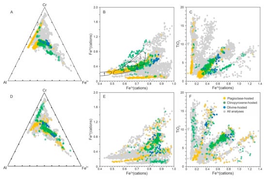 - Kamenetsky, V.S.; Crawford, A.J.; Meffre, S. Factors controlling chemistry of magmatic spinel: An empirical study of associated olivine, Cr-spinel and melt inclusions from primitive rocks. J. Petrol. 2001, 42, 655–671. [Google Scholar] [CrossRef]