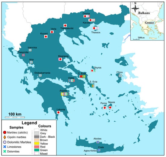 The selection of a rock as a building material is determined by its aesthetic characteristics and its physico-mechanical properties []. The Greek carbonate stone products are characterized by their high quality, diversity, and are prized for decorative and sculptural uses []. It has been used from small to iconic works around the world, including the Mecca shrine, the Shanghai Opera House and the Barcelona airport, (white marble of Thassos), the building of French State Television, the Grand Tasmanian Abu Dhabi, the parliaments of several former Soviet republics (Volakas marble), as well as the famous Reflection towers in Singapore (Ariston Drama marble). Their uniqueness is strongly correlated with their aesthetic characteristics that have a significant impact on their market price [,,,]. The aesthetic characteristics are highly dependent upon factors that include: (a) color variability (b) mineral assemblage, (c) petrographic textural features, (d) grain size, (e) modal composition and (f) degree of metamorphism and/or metasomatism, deformation and schistocity. The wide range of colour varieties reflects the wide variability of their mineral composition, degree of recrystallization and the presence of impurities likely associated with secondary hydrothermal activity []. Their structural defects mainly include discontinuities that can either be empty cavities or filled with compact and loose materials that alter their appearance and mechanical integrity. The petrographic characteristics of rocks affect their macro-mechanical properties. Mineral composition, grain size and microstructure are the most important parameters to influence rock strength and deformability [].