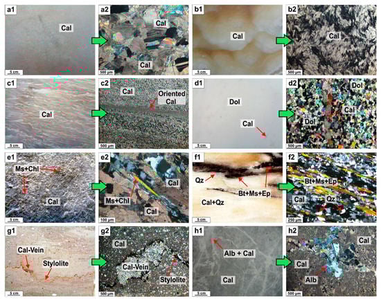 Macroscopic images and crossed polars photomicrographs (1 and 2 respectively) (a) Calcitic marble sample KM_1 composed of hypidiomorphic calcite (Cal) crystals. (b) The “crinkled” structure of alabaster calcitic marble STE_12 composed of elongated anisotropic calcite (Cal) crystals gathering in groups with different orientation. (c) Calcitic marble sample TH-3 composed of oriented calcite (Cal) crystals of different grain size. (d) Dolomitic marble sample AM_19 in which calcite (Cal) occurs in veins within a dolomite (Dol) rich groundmass. (e) Cipollino marble sample TH-6 including calcite (Cal) crystals along with muscovite (Ms), chlorite (Chl) and quartz (Qtz) (f) Calcitic marble sample TH-2 including calcite (Cal) crystals along with muscovite (Ms). (g) Limestone sample H_7 including secondary calcite veins (Cal) and stylolites. (h) Dolomite sample STE_1 consisting of dolomitic (Dol) groundmass and veins of secondary material filled with calcite (Cal) and albite (Alb).