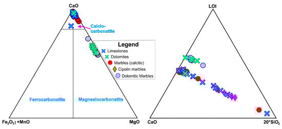 Ternary discrimination diagram of carbonated samples in the fields of calciocarbonatite, ferrocarbonatite and magnesiocarbonatite (left). Ternary CaO–20*SiO2–LOI diagram depicting the relationship between the SiO2 content and the CaO/LOI ratio (right). Green square: limestone, pink circle: marble; blue triangle: dolomite. (after Woolley and Kempe, 1989 []).