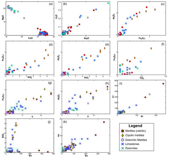 (a–k) Binary plots of selected major and trace elements, displaying their chemical behavior. Diagrams (b,k) are modified from Badouna et al., 2016 [].