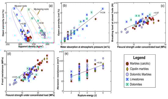 Binary diagrams of selected physico-mechanical properties: (a)Apparent density—Open porosity, (b) Water absorption at atmospheric pressure—Open porosity, (c) Flexural strength under concentrated load—Breaking load at dowel hole, (d) Flexural strength under concentrated load—Frost Resistance, (e) Rupture energy—Abrasion Resistance. The regression lines (solid) and the correlation coefficient (r) values are also given.