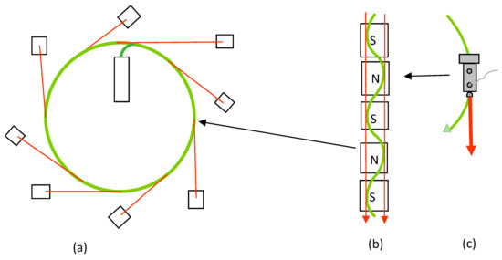 (a) Diagram of a synchrotron storage ring in which an electron beam (green) is traveling clockwise. (b) Every time the electron beam passes through a vertical magnetic field above the north end of a “C-shaped” magnet (N) and below the south end of the “C-shaped” magnet (S), the magnetic field causes the electron beam to be steered to the right. Every time the electron beam passes through the inverted magnetic field, it is steered to the left. Much more intense beams (shown as red arrows) can be produced if the electron beam passes through a series of alternating magnetic fields in a straight section of the ring, so that the beams produced at all the crests and troughs are added together. These are called wigglers or undulators. (c) Every time the beam is deflected, some of its energy is converted to an electromagnetic beam shining in a forward direction, like the headlight on a locomotive (c). Pipes leading off tangentially from the storage ring at the bending magnets, wigglers and undulators carry the X-ray beams to workstation hutches (rectangles) for experiments. Where there is no magnetic field, the electrons travel in a straight line and produce no electromagnetic beam.