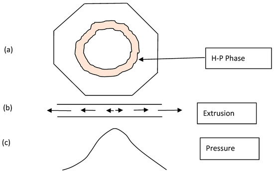 Olivine structure sample squeezed between diamond anvils with no gasket (a) View down through the upper diamond anvil. (b) The distribution of shear stress due to extrusion. (c) The distribution of pressure. In every run for every composition the spinel phase made its first appearance where the shear stress, not the pressure, was greatest. Of course, this did not give any direct information about crystal structures and the intermediate structure, but it did illustrate that all the samples with olivine structure showed the same behavior [4,5].