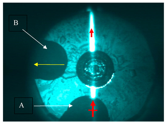 View of the X-ray beam entering and exiting the central, round fluid sample chamber in the lower diamond as seen through the unaltered upper diamond anvil. The entering X-ray beam (longer red arrow with a cross line to indicate polarization orientation, i.e., the electric vector). Diamond was removed from the lower anvil by laser ablation to form the two notches (A and B), to minimize attenuation of the X-rays as they pass through diamond, and is the reason that the beam itself does not cause fluorescence as it passes through notch A before it enters the fluorescent diamond anvil, where it appears white due to over exposure, and its less intense scattered blue fluorescence illuminates the anvil’s features. A very faint fluorescent line shows its course through the fluid sample in the circular recess in the center of the lower anvil face. The shorter red arrow shows the direct beam exiting the sample chamber, and the yellow arrow shows the very weak emitted beam directed to the detector, where its spectrum can be analyzed [7].