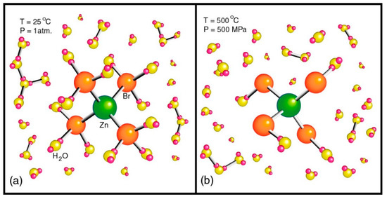 (a) This hydration shell surrounding a ZnBr42− ion is typical of the structures we found for the hydrated molecules of a range of compositions. (b) At 500 °C and 500 MPa, the sample density, although above the critical point, is only slightly less than the liquid phase. Some of the outermost H2O molecules become detached from of ZnBr42− ion. Other compounds in solution such as rare-earth bromides have very different complex configurations and responses to temperature [7].