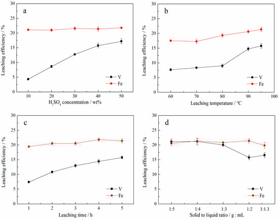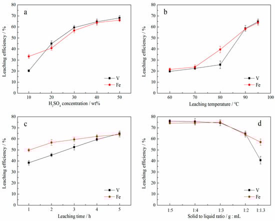The leaching efficiency of V and Fe from the roasted ore at different leaching conditions. Variables: (a) the H2SO4 concentration; (b) the leaching temperature; (c) the leaching time; (d) the solid to liquid ratio.