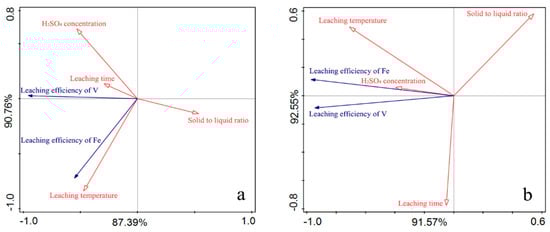 Correlations among the leaching parameters of H2SO4 concentration, leaching temperature, leaching time, and solid to liquid ratio, alongside the leaching efficiency of V and Fe, were analyzed by redundancy analysis (RDA) with Canoco software. These results are shown in Figure 3.