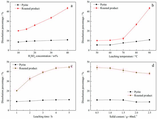 The dissolution of pyrite and its roasted product at different conditions. Variables: (a) the H2SO4 concentration; (b) the leaching temperature; (c) the leaching time; (d) the solid content.