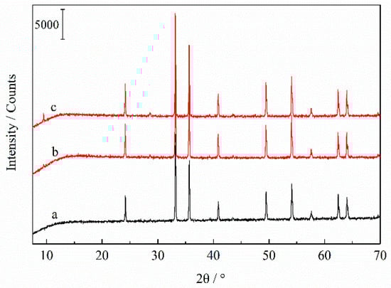 XRD patterns of the leaching residue of the roasted pyrite at different leaching times. (a) the roasted sample; (b) the leaching residue of the roasted sample with a leaching time of 1 h; (c) leaching residue of the roasted sample with a leaching time of 4 h.