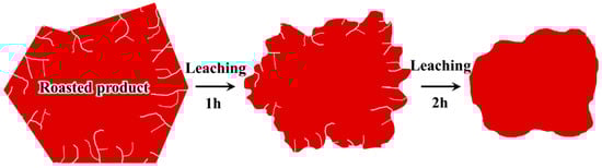 The SEM images indicated that the roasted product of pyrite was porous and stacked (Figure 6a). The increased porosity resulting from the decomposition of pyrite has been well documented [26]. The particles leached in sulfuric acid solution for 1 h (Figure 6b) presented higher roughness with many pits, and the roughness further increased with the leaching time (Figure 6c). However, local details showed that the particles leached for 4 h were dense and had a smooth surface. It can be concluded from the morphology variation and the leaching behavior that the outer sphere of the roasted product is porous and easily dissolved. However, the inner core of the roasted product is dense and difficult to be dissolved. A graphical representation (Figure 7) reveals the dissolution process of the roasted product, based on both the acid leaching results and the microscopic morphology analysis.