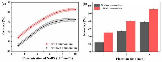 As depicted in Figure 1a, the recoveries of sulfidized malachite without and with ammonium both increased with increasing NaBX concentration. More importantly, recovery for sulfidized malachite with ammonium was higher over the entire range of NaBX concentrations than for sulfidized malachite without ammonium. As shown in Figure 1b, sulfidized malachite has a higher flotation rate in the presence of ammonium. These results indicated the positive effects of ammonium on the sulfidization flotation of malachite. Previously, Park et al. [21] had also observed that the average recovery of malachite sulfidized with (NH4)2S appeared slightly higher than that sulfidized with Na2S.
