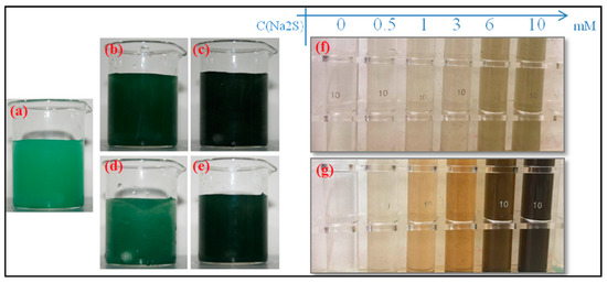 Figure 2. (ae) Malachite particles in deionized water, after treatment with (a) deionized water alone, (b) 5 × 10−4 M Na2S and 5 × 10−4 M NH4+, (c) 3 × 10−3 M Na2S and 6 × 10−3 M NH4+, (d) 5 × 10−4 M Na2S alone, and (e) 3 × 10−3 M Na2S alone. (f,g) Residual liquids after treatments at different conditions (f) with ammonium and (g) without ammonium; the concentrations of ammonium ions were twice those of sulfide ions shown above the photo.
