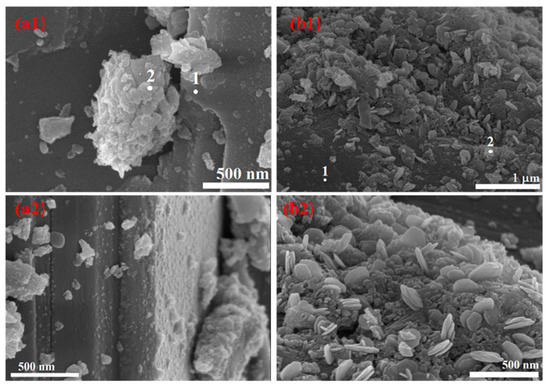 Previously, Wu et al. [11] and Shen et al. [14] had studied this topic using SEM-EDS. However, nothing interesting was observed, because of the limited magnification and resolution. Herein, FESEM with high magnification and high resolution was used to observe the morphology of sulfidized malachite produced with and without ammonium. Figure 3a1,a2 shows FESEM images of malachite treated only with 5 × 10−4 M sodium sulfide solution. The malachite surfaces appeared to be coated with a layer of mud-like material. EDS results in Figure 4a show that the mud-like material contained sulphur (Spot 2 in Figure 3a1), while no sulphur was detected in the surrounding areas (Spot 1 in Figure 3a1), indicating that these mud-like materials were a solid sulfidization product.