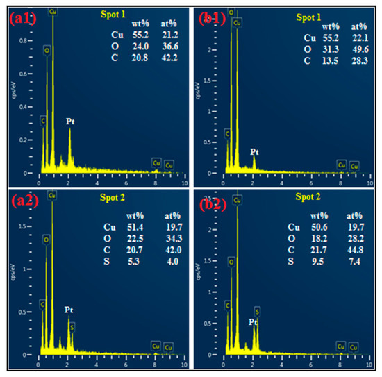 Figure 4. EDS results for sulfidized malachite produced (a1,a2) without of ammonium and (b1,b2) with ammonium, corresponding to Figure 3a,b, respectively.