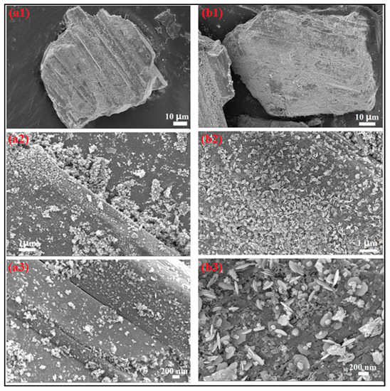 Figure 5. FESEM images of sulfidized malachite (a1,a2,a3) without ammonium and (b1,b2,b3) with ammonium. C(Na2S) = 3 × 10−3 M, C(NH4+) = 6 ×10−3 M.