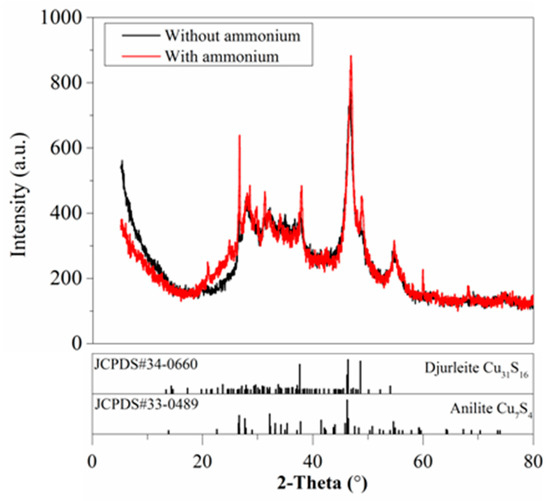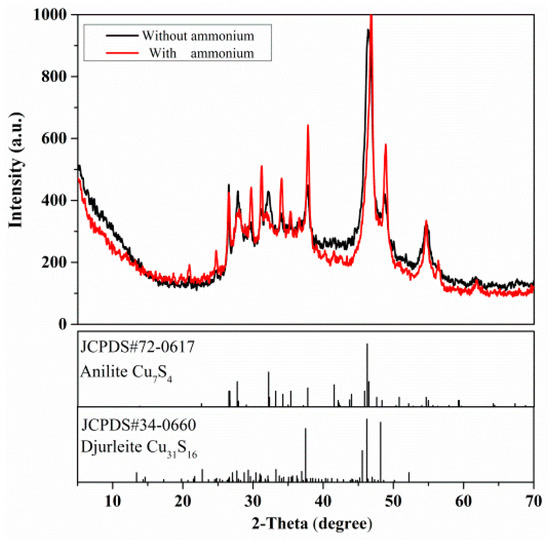 Figure 6 shows the XRD patterns of the sulfidization products that were extracted from the malachite treated with 5 × 10−4 M Na2S. The results showed that both Cu31S16 (djurleite) and Cu7S4 (anilite) comprised the sulfidization products, regardless of the presence or absence of ammonium. However, the proportion of Cu31S16 was higher in the presence of ammonium. When the concentration of sodium sulfide was increased to 3 × 10−3 M, similar results were obtained (Figure 7). The XRD results show that the sulfidization products of malachite were the copper-deficient Cu2−xS phases, regardless of the presence or absence of ammonium.