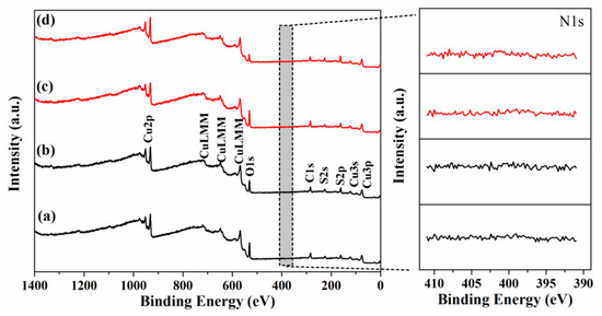 Figure 8. XPS survey spectra (left) and corresponding high-resolution N1s spectra (right) of malachite treated with (a) 5 × 10−4 M Na2S alone, (b) 3 × 10−3 M Na2S alone, (c) 5 × 10−4 M Na2S and 1 × 10−3 M NH4+, (d) 3 × 10−3 M Na2S and 6 × 10−3 M NH4+.