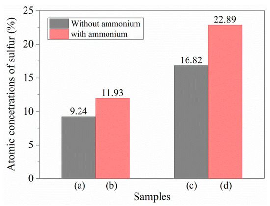 The atomic concentrations of sulphur on four sample surfaces were calculated on the basis of their high-resolution S2p spectra (Figure 9). Sulfidized malachite surfaces with ammonium showed sulphur concentrations substantially higher than sulfidized malachite surfaces without ammonium, a pattern consistent with previous work [11,12].