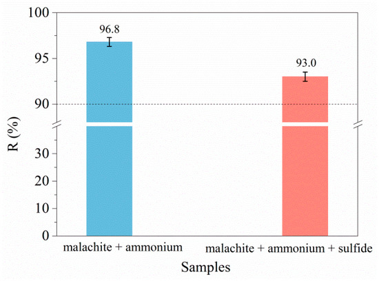 The actions of ammonium during malachite sulfidization remain to be determined, so this question was further studied using solution analysis. Figure 10 shows the residual ratio of ammonium nitrogen in solution. After treatment with ammonium solution for 3 min, the residual ratio of ammonium nitrogen still remained at 96.8%. After treatment with ammonium and sulfide in sequence, the residual rate still remained high at 93.0%.