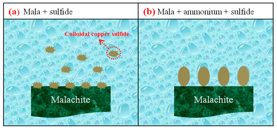 The findings of this study suggest that we do require to rethink the mechanism of ammonium ions on malachite sulfidization. According to our characterizations and analyses, regardless of the presence or absence of ammonium, malachite sulfidization is clearly a heterogeneous solidliquid reaction in which the solid product attaches to the unreacted malachite, and sulfidization products on malachite are not a monatomic layer but a solid polyatomic layer. Hence, malachite sulfidization, i.e., the formation of copper-deficient Cu2−xS phases on malachite surfaces, involves heterogeneous nucleation and growth. FESEM images highlight the larger particle size and greater stability of sulfidization products produced in the presence of ammonium. Thus, we can infer that ammonium plays a key role in mediating the nucleation and growth of sulfidization product crystals during malachite sulfidization, producing larger sulfidization product particles. The larger size of sulfidization product may result in a darker, stabler and denser sulfidization product-coating layer, which is noteasily detached to reduce the formation of colloidal copper sulfide in the residual liquids. Ultimately, ammonium facilitates better performance of sulfidization flotation of malachite. Based on the above results and discussion, a schematic diagram of the sulfidized malachite produced without and with ammonium is proposed (Figure 11). However, further work is required to determine the mediation mechanisms of ammonium on the nucleation and growth of the sulfidization product.