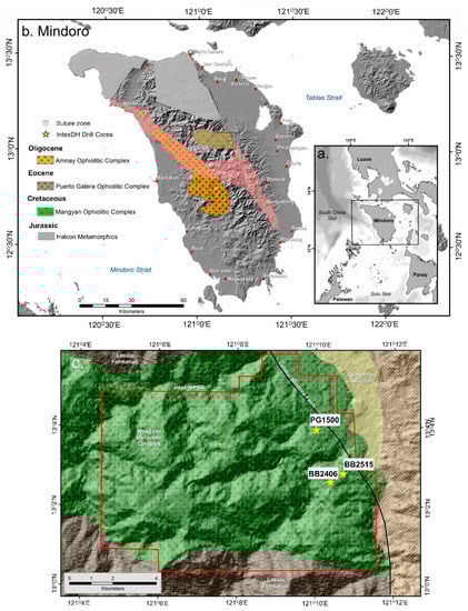 Three ophiolite belts are found in the Mindoro Suture Zone; Cretaceous Manyan Complex, Eocene Puerto Galera Complex, and mid-Oligocene Amnay Complex (Figure 1b) [,,]. The multiphase collisions that occurred from Early to Middle Miocene along this suture zone result in the exposure of the various ophiolites in the island [,].
