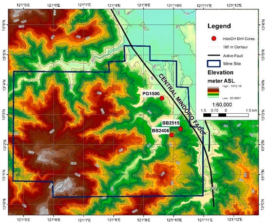 The Intex exploration project area lies in the Mangyan Ophiolitic Complex in the north-central part of the island, which is 40 km south of Calapan. A total of three laterite profiles, namely BB2515, PG1500, and BB2406, were selected for this study (Figure 1c). These profiles were chosen based on the availability of complete horizons (saprolite and limonite) and the location of the laterite profiles (topmost ridges). The Intex’s concession area covers approximately 113 km2 with an elevation that ranges from 135 m in the northeast section to 1460 m near the southwest section (Figure 2).