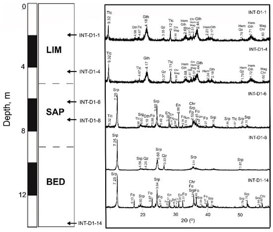 Stacked XRPD patterns of bedrock, saprolite, and limonite representative samples from BB2515 drill core. Fo—forsterite, En—enstatite, Srp—serpentine, Tlc—talc, Qz—quartz, Chr—chromite, Mag—magnetite, Gth—goethite, Hem—hematite.