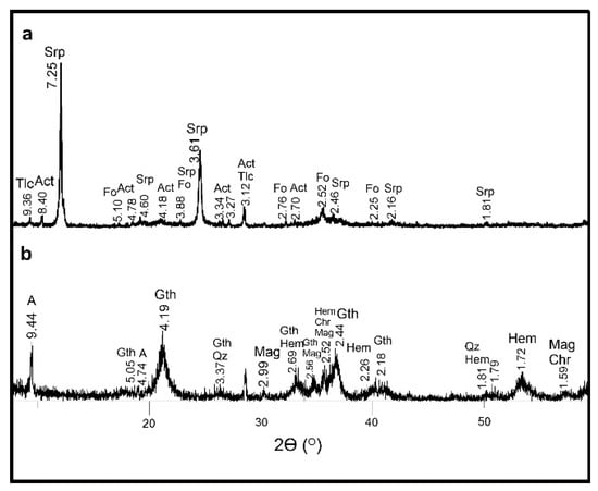 XRPD patterns of samples showing the (a) occurrence of serpentine, actinolite, talc and relict olivine, and (b) presence of asbolane with goethite, hematite, magnetite, chromite, and quartz. Srp—serpentine, Act—actinolite, Fo—forsterite, Tlc—talc, A—asbolane, Gth—goethite, Mag—magnetite, Hem—hematite, Chr—chromite, Qz—quartz.