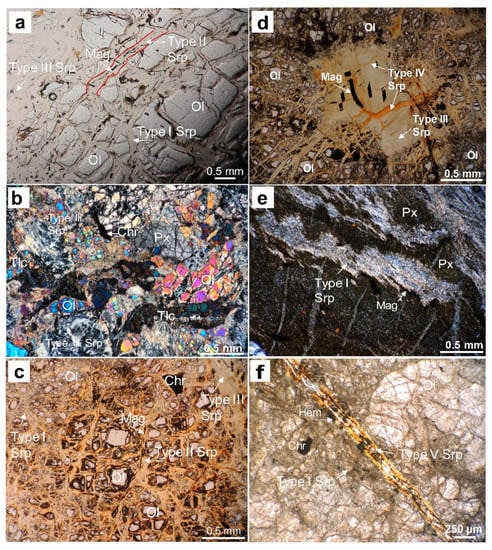 Photomicrographs of (a,b) type I, II and III serpentine veins cutting primary olivine, pyroxene, chromite, and Fe-oxide in lherzolite (BB2515 core); serpentine veins in the saprock developed above (c) lherzolite (BB2515 core), (d) harzburgite-dunite (BB2406 core), and (e,f) clinopyroxenite (PG1500 core). Ol—olivine, Px—pyroxene, Srp—serpentine, Tlc—talc, Chr—chromite, Gth—goethite.
