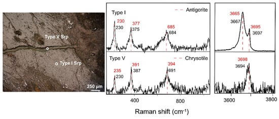 Raman signatures of type I and type V vein serpentines identified in the saprock developed above clinopyroxenite bedrock (PG1500 core). Red dashed lines indicate the Raman bands from previous work [,].